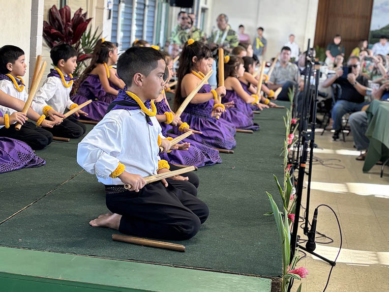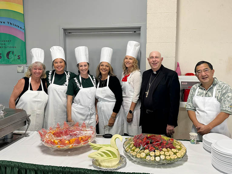 A delicious buffet breakfast was served by teachers and parents to more than 425 people over three seatings. Entertainment was provided by the school’s young singers and musicians, directed by Kekoa Kato and Tiffany Gore, and its hula halau, directed by Jack McKeague and Michael Borsa. Bishop Silva spoke on the school’s success, and Hawaii Catholic Schools Superintendent Llewellyn Young spoke on the value and importance of a Catholic education.