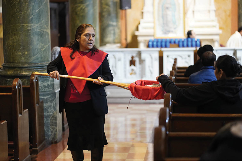 Above: Second collections allow parishioners to help people they normally would not encounter. An usher took up a collection during Mass last April at St. Rose of Lima Church in the Kensington section of Brooklyn, New York. (Gregory A. Shemitz / OSV News)