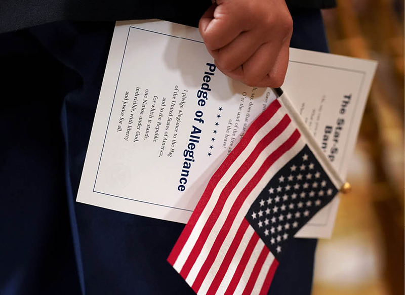 Above: A U.S. flag and a copy of the Pledge of Allegiance are held during a naturalization ceremony at the White House in Washington. (Kevin Lamarque / Reuters / CNS / 2021)