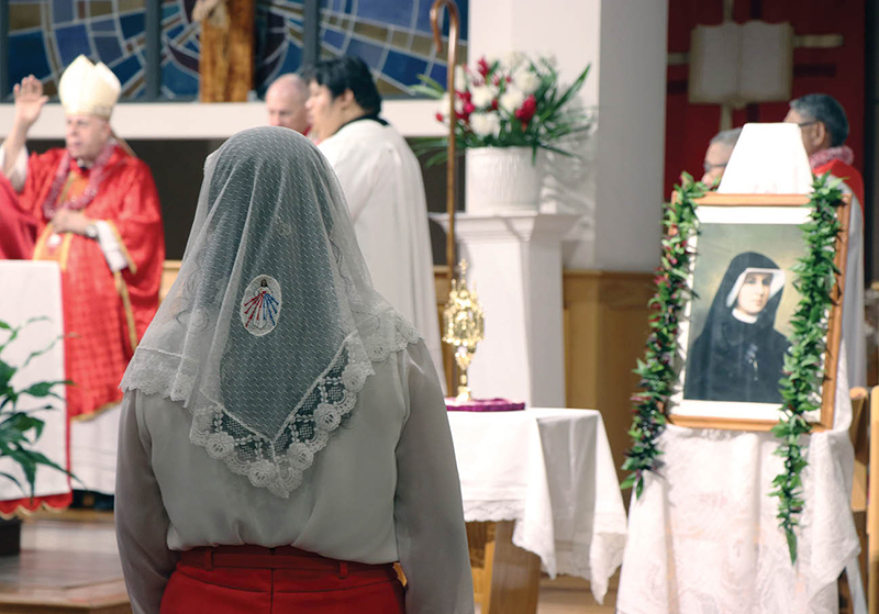 At top: Above, images of the Divine Mercy could be found throughout St. Joseph Church, including on one parishioner’s veil, during the Mass enshrining a first-class relic of St. Faustina at the parish. At right, Bishop Larry Silva blessed the relic, which was displayed during Mass and placed into its wooden shrine after the liturgy and veneration. (Photos by Celia K. Downes / Hawaii Catholic Herald)
