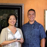 Joy Bulosan, left, who has served as assistant to Bishop Larry Silva since 2009, marked her last day on the job Aug. 30. Bulosan leaves behind the bishop’s office to take on a new role as Director of Volunteer Services and Community Engagement at Catholic Charities Hawaii. (HCH photo | Darlene Dela Cruz)