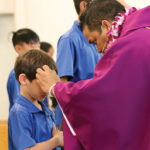 ASH WEDNESDAY Arie Swynenberg, a second grader at St. Elizabeth School in Aiea, receives ashes from St. Elizabeth’s parochial vicar, Father Romple Emwalu, at the school’s Ash Wednesday Mass, Feb. 26. (HCH photo |Anna Weaver) Bonus Web Photos