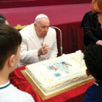 Pope Francis blows out the candle on his birthday cake during an audience with children assisted by the Vatican’s pediatric clinic in the Paul VI Hall Dec. 17, 2023, his 87th birthday. (CNS photo/Vatican Media)